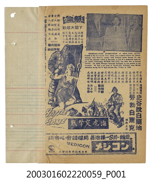 本件為臺北新生戲院1950、1960年代提供觀眾的電影本事,單色印刷。該面上標題為「新生(SHIN SHENG THEATER)」、「下期大獻映」等字樣,其下為美國片《海虎突擊戰》(Battle Flame, 1959)的電影劇照及中英文的文案廣告,特別強調本片在東京東寶劇場「創近三年來最高賣座紀錄」等。該片由聯藝電影公司出品,史賓斯廷(R.G. Springsteen)執導,史谷脫白蘭地(Scott Brady)、勞勃白萊克(Robert Blake)等主演的黑白戰爭劇情片,描述以韓戰為背景的戰爭故事;下方另有藥品廣告。