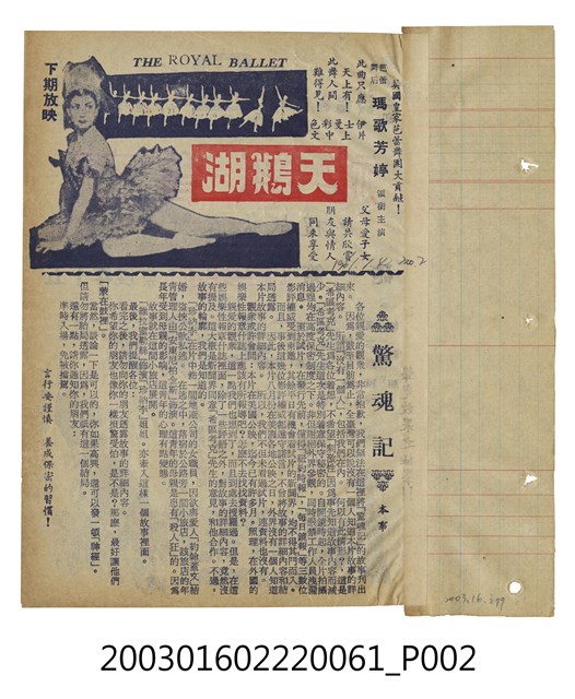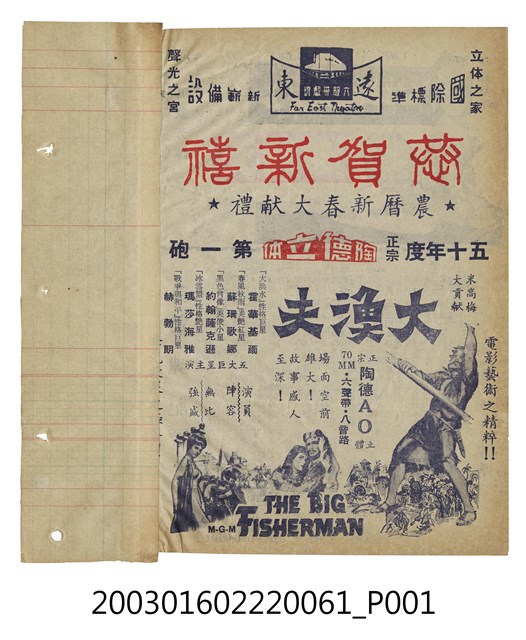 遠東戲院發行《大漁夫》電影本事,出自「竜沙影集」電影本事剪貼簿。本件為臺北遠東戲院1950、1960年代提供觀眾的電影本事,單色印刷。該面上標題為「遠東(Far East Theatre)」、「六聲帶戲院」、「五十年度正宗陶德立体第一砲」等字樣。其下為美國片《大漁夫》(The Big Fisherman, 1959)的電影劇照及文案廣告。本片由法蘭克勃洛茲(Frank Borzage)執導,霍華基爾(Howard Keel)、蘇珊歌娜(Susan Kohner)、約翰薩克遜(John Saxon)、瑪莎海雅(Martha Hyer)、赫勃朗(Herbert Lom)等主演的戰爭歷史片。