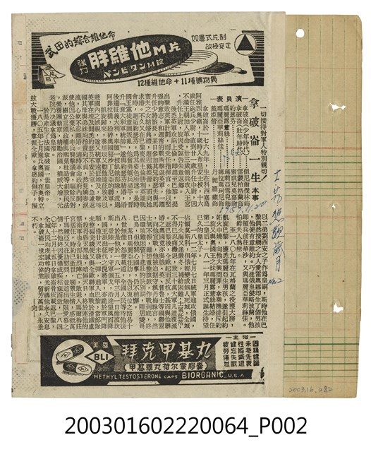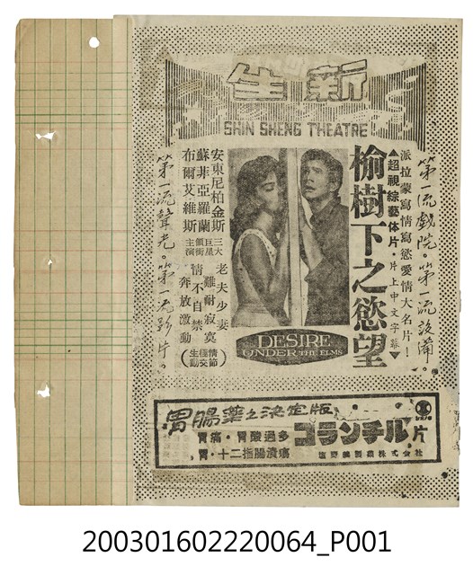 本件為臺北新生戲院1950、1960年代提供觀眾的電影本事,單色印刷。該面上標題為「新生(SHIN SHENG THEATRE)」等字樣,其下為美國片《榆樹下之慾望》(Desire Under the Elms, 1958)的電影劇照及文案廣告,強調為「超視綜藝體片」。本片由派拉蒙電影公司出品,戴伯特曼(Delbert Mann)執導,安東尼柏金斯(Anthony Perkins)、蘇菲亞羅蘭(Sophia Loren)、布爾艾維斯(Burl Ives)等主演的黑白劇情片,描述農場家族一對老夫少妻所發生的愛慾糾葛悲劇故事;下方另有藥品廣告。