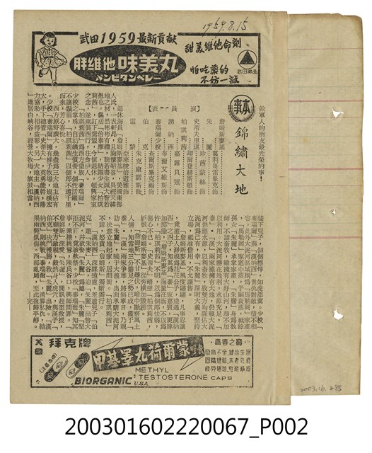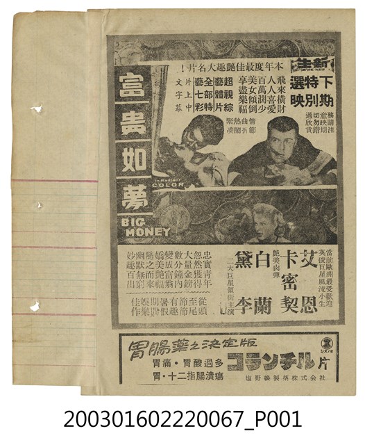 本件為臺北新生戲院1950年代提供觀眾的電影本事,單色印刷。該面右上標題為「新生(SHIN SHENG THEATRE)」、「下期特別選映」等字樣,其下為英國片《富貴如夢》(The Big Money, 1956)的電影劇照及文案廣告,強調為「超視綜藝體片、全部特藝七彩」。本片由約翰派帝卡斯特(John Paddy Carstairs)執導,艾恩卡密契(Ian Carmichael)、白蘭黛李(Belinda Lee)等主演的彩色喜劇片,描述年輕人飛來橫財成為富翁而招來艷福的幽默趣事;下方另有藥品廣告。