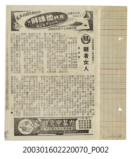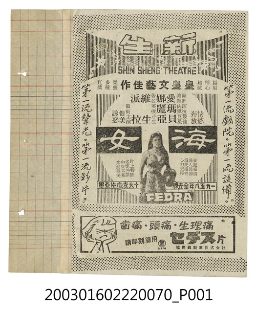 本件為臺北新生戲院1950年代提供觀眾的電影本事,單色印刷。該面右上標題為「新生(SHIN SHENG THEATRE)」、「皇皇文藝佳作」等字樣,其下為西班牙片《海女》(Fedra, 1956)的電影劇照及文案廣告,宣傳為「一九五八年全世界十大賣座片亞軍」。本片由馬諾門歐堤(Manuel Mur Oti)執導,愛瑪貝娜麗亞(Emma Penella)、維生派拉(Vicente Parra)等主演的彩色劇情片,描述一野性女子對男人充滿誘惑力而招致其他女性怨恨的故事;下方另有藥品廣告。