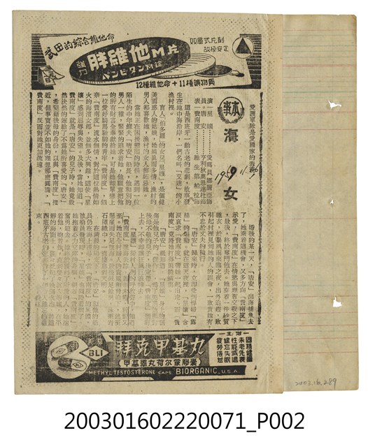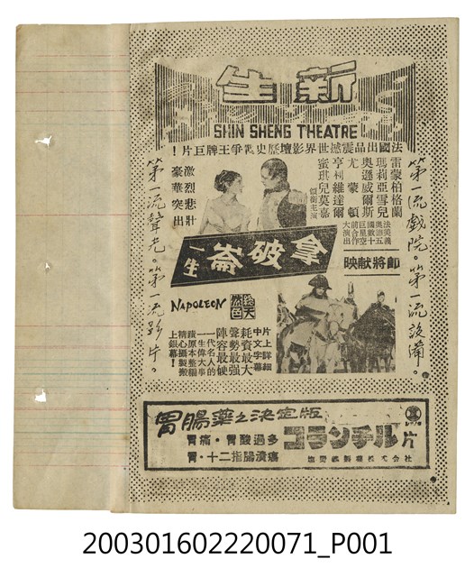 本件為臺北新生戲院1950年代提供觀眾的電影本事,單色印刷。該面上標題為「新生(SHIN SHENG THEATRE)」、「法國出品震撼世界影壇歷史戰爭王牌巨片」等字樣,其下為《拿破崙一生》(Napoléon, 1955)的電影劇照及文案廣告,本片由沙加基奇(Sacha Guitry)執導,雷蒙柏格蘭(Raymond Pellegrin)、瑪莉亞雪兒( Maria Schell)、尤蒙頓(Yves Montand)、亨利維達爾(Henri Vidal)、蜜琪兒莫嘉(Michèle Morgan)等主演的彩色劇情片,是一部描述拿破倫一生的傳記電影;下方另有胃腸藥品廣告。