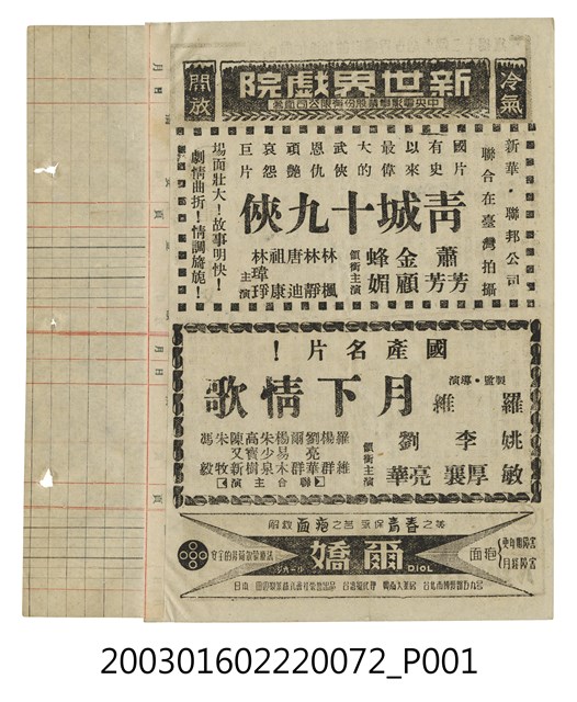 本件為臺北新世界戲院1960年代提供觀眾的電影本事,單色印刷。上方為標題「新世界戱院」、「中央電影事業股份有限公司直營」、「冷氣開放」等字樣;其下為古裝黑白國語片《青城十九俠》(1960)的電影文案廣告,本片由新華、聯邦電影公司在臺灣攝製,屠光啓執導,蕭芳芳、金顧(金峰)、蜂媚 (顧媚)等主演, 林楓、 林靜、唐迪、 祖康、林瑋琤等聯合演出的武俠片。下方則主打另部國語片《月下情歌》電影文案廣告,本片由羅維監製及執導,姚敏、李厚襄、劉亮華領銜主演;羅維、楊群、爾群、楊易木、朱少泉、高寶樹、陳又新、朱牧、馮毅等合演。