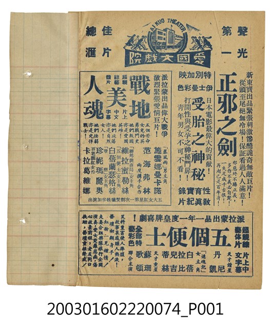 本件為臺北愛國大戲院1960年代提供觀眾的電影本事,單色印刷。該面上標題為「愛國大戱院(AI KUO THEATER)」、「聲光第一」、「佳片總匯」等字樣。其下為美國片《戰地美人魂》(5 Branded Women, 1960)、新東寶出品的日本電影《正邪之劍》,以及特別加映的紀錄片《受胎之神祕》三部電影的文案廣告。《戰地美人魂》由施雲娜曼卡諾(Silvana Mangano)、范海弗林(Van Heflin)、維拉蜜勒絲(Vera Miles)、白蓓蘭瑟格絲(Barbara Bel Geddes)、珍妮瑪麗奧(Jeanne Moreau)、卡拉葛維娜(Carla Gravina)主演,描述二戰時期五位南斯拉夫的女性參加游擊隊對抗德軍納粹的故事。
