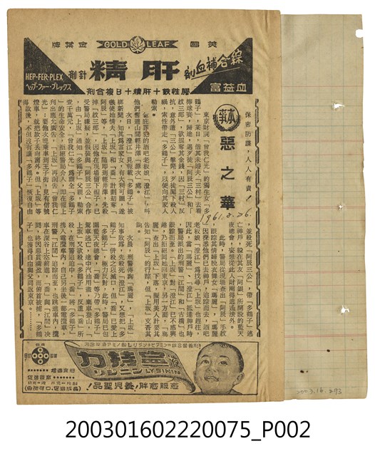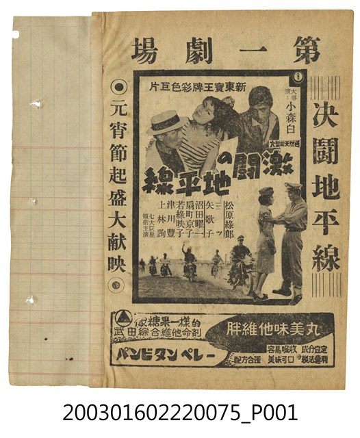本件為臺北第一劇場1960年代提供觀眾的電影本事,單色印刷。該面上標題為「第一劇場」等字樣。其下為日本片《決鬪地平線》(1960)的電影劇照及文案廣告,本片由新東寶電影公司出品,小森白執導,松原綠郎、三ツ矢歌子、沼田曜一、扇町京子、若綠映子、津川豐、上林詢等主演的彩色戰爭劇情片;下方另有藥品廣告。
