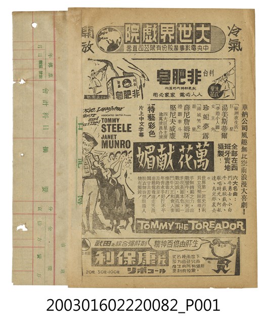 本件為臺北大世界戲院1960年代提供觀眾的電影本事,單色印刷。該面上標題為「大世界戲院」、「中央電影事業股份有限公司直營」、「冷氣開放」,以及利台「非肥皂」廣告等字樣。其下為英國片《萬花獻媚》(Tommy the Toreador, 1959)的電影文案廣告,本片由華納電影公司出品,約翰派帝卡斯特(John Paddy Carstairs)執導,湯美斯蒂爾(Tommy Steele)、珍妮夢露(Janet Munro)、薛尼詹姆斯(Sidney James)、堅尼夫威廉(Kenneth Williams)等主演的喜劇歌舞片,描述一位環遊世界樂觀愛唱歌的水手拜訪西班牙所發生的趣事。下方另有藥品廣告。