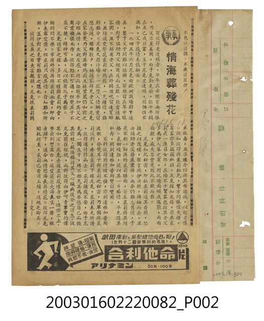 大世界戲院發行《萬花獻媚》電影本事,出自「竜沙影集」電影本事剪貼簿。