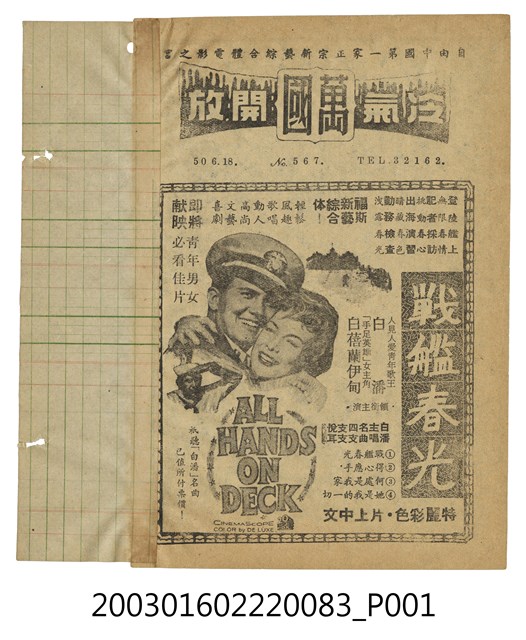 本件為臺北萬國戲院1961年提供觀眾的電影本事,單色印刷。該面上標題為「萬國」、「自由中國第一家正宗新藝綜合體電影之宮」、「冷氣開放」,以及日期「50.6.18」、期數「No. 567」、電話號碼「TEL 32162」等字樣。其下為美國片《戰艦春光》(All Hands on Deck, 1961)的電影劇照及文案廣告,本片由福斯電影公司發行,諾曼陶格(Norman Taurog)執導,白潘(Pat Boone)、白蓓蘭伊甸(Barbara Eden)等主演的音樂喜劇,描述一艘海軍軍艦上所發生的風趣愛情故事。