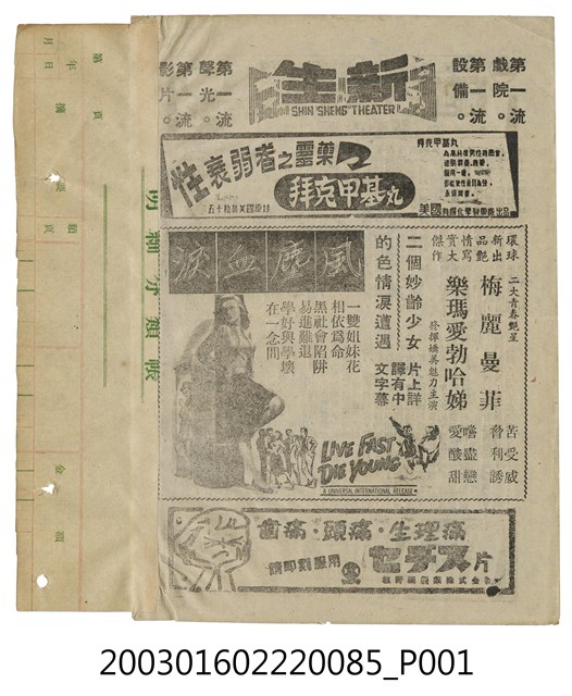 本件為臺北新生戲院、1950、1960年代提供觀眾的電影本事,單色印刷。該面上標題為「新生(SHIN SHENG THEATER)」、「第一流戲院」、「第一流設備」、「第一流聲光」、「第一流影片」等字樣,其下有藥品廣告,以及美國片《風塵血淚》(Live Fast, Die Young, 1958)的電影劇照及文案廣告,本片由環球電影公司出品,保羅漢瑞德(Paul Henreid)執導,梅麗曼菲(Mary Murphy)、樂瑪愛勃哈娣(Norma Eberhardt)等主演的彩色犯罪劇情片,描述 一對姐妹花離家踏上充滿陷阱現實的故事,下方另有藥品廣告。