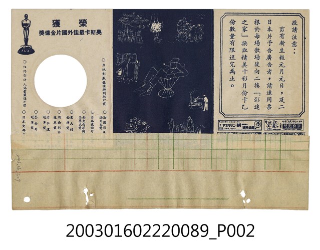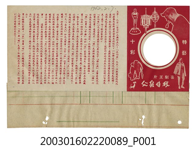 本件出自「竜沙影集」電影本事剪貼簿,為1950、1960年代戲院提供的電影本事,雙面雙色印刷。本件為其中一面,另一面為館藏號2003.016.0307。