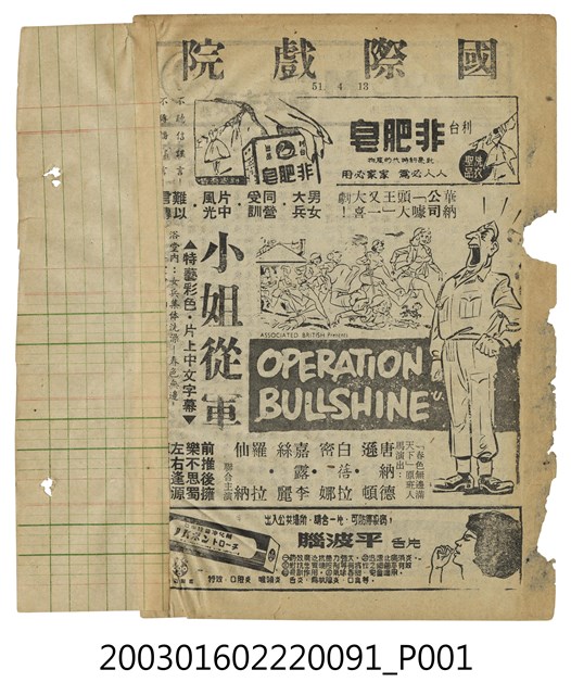 本件為臺北國際戲院1962年提供觀眾的電影本事,單色印刷。該面上有標題「國際戲院」、日期「51.4.13」,以及利台「非肥皂」廣告等字樣。其下為英國片《小姐從軍》(Operation Bullshine, 1959)的電影劇照及文案廣告,本片由華納電影公司出品,吉爾伯甘(Gilbert Gunn)執導,唐納德遜頓(Donald Sinden)、白蓓拉密娜(Barbara Murray)、嘉露李絲麗(Carole Lesley)、羅拉仙納(Ronald Shiner)等主演的軍中喜劇片。下方另有藥品廣告。