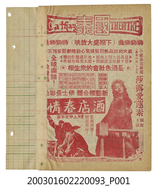 本件為臺北國泰戲院1960年代提供觀眾的電影本事,單(紅)色印刷。該面上標題為「國泰戲院」(Cathay THEATRE),以及「下期盛大放映」等字樣。其下為義大利片《酒店春情》的電影劇照及文案廣告,本片是由義大利電影公司出品,由《霸海妖姬》女主角、有小蘇菲亞羅蘭之稱的女主角莎露愛蓮素所主演的劇情片。