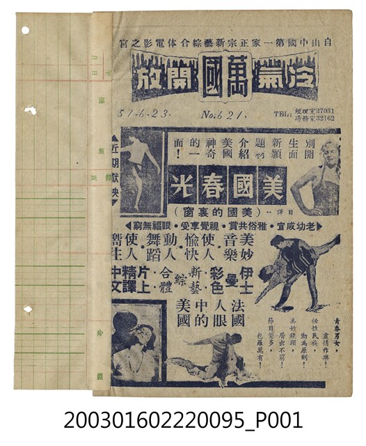 萬國戲院發行《美國春光》電影本事,為該戲院本事第621期,出自「竜沙影集」電影本事剪貼簿。