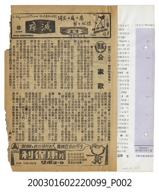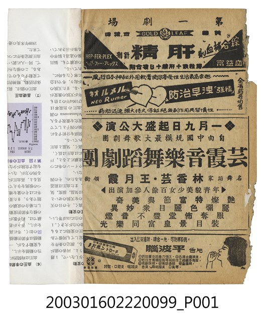 本件為臺北第一劇場提供的宣傳單,單色印刷。該面上標題為「第一劇場」,以及藥品廣告等字樣。其下為藝霞音樂舞蹈劇團的演出廣告,包括「一月九日起盛大公演」、「自由中國規模最大歌舞劇團」、「名舞蹈家林香芸、王月霞領銜」、「年青貌美少女百餘人參加演出」等字樣;下方有藥品廣告。