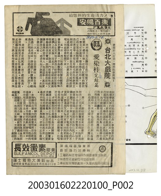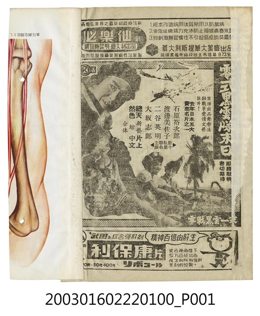 本件出自「竜沙影集」電影本事剪貼簿,推測為1960年代的電影本事,單色印刷。該面上為藥品廣告,其下為日本片《零式黑雲隊末日》(1962)的電影劇照及文案廣告,本片由日活電影公司出品,舛田利雄執導,石原裕次郎、渡邊美佐子、二谷英明、大坂志郎等主演的戰爭愛情文藝片,描述二戰末期一名海軍飛行中尉派駐所羅門孤島所發生的故事。下方另有藥品廣告。