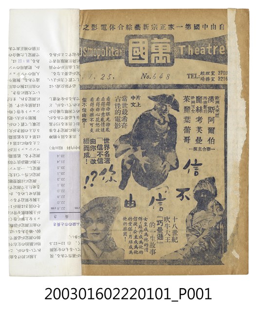 本件為臺北萬國戲院1963年提供觀眾的電影本事,單色印刷。該面上標題為「萬國」、「自由中國第一家正宗新藝綜合體電影之宮」、「Cosmopolitan Theatre」,以及日期「(52).1.25」、期數「No. 648」,以及電話號碼「TEL經理室3703(1)、場務室3216(2)」等字樣。其下為《信不信由你》(Münchhausen, 1943)的電影劇照及文案廣告,本片改編自世界名著《信不信由你》,由漢斯阿爾伯(Hans Albers)、麗茲考芙曼、茱麗葉蕾哥等主演的劇情片,描述十八世紀吹牛大王「巧曼遜」的一生故事。