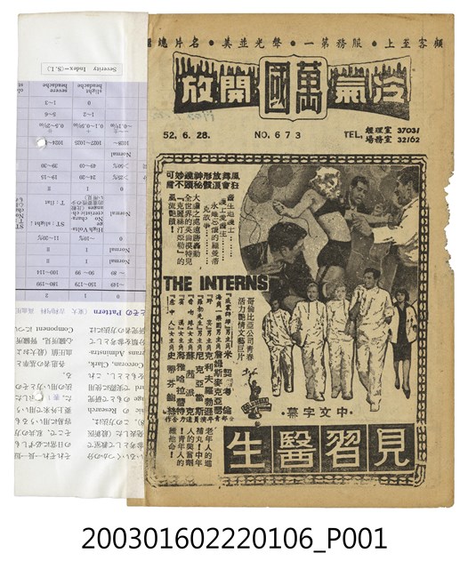 本件為臺北萬國戲院1963年提供觀眾的電影本事,單色印刷。該面上標題為「萬國」以及日期「52.6.28」、期數「No. 673」,以及電話號碼「TEL經理室37031、場務室32162」等字樣。其下為美國片《見習醫生》(The Interns, 1962)的電影劇照及文案廣告,本片由哥倫比亞電影公司發行,大衛史威福特(David Swift)執導,米契考倫(Michael Callan)、詹姆斯麥克亞瑟(James MacArthur)、克利夫羅勃遜(Cliff Robertson)、尼克亞當斯(Nick Adams)、蘇茜派克(Suzy Parker)、海雅哈拉蕾特(Haya Harareet)、史蒂芬鮑絲(Stefanie Powers)等主演的劇情片,描述一群年輕實習醫生所遭遇的各種醫療專業及人生經歷的起伏故事。