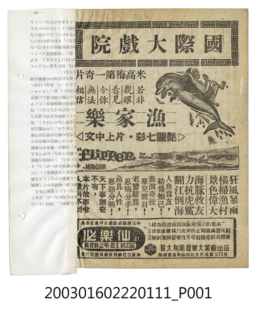本件為國際大戲院1960年代提供觀眾的電影本事,單色印刷,出自「竜沙影集」剪貼簿。該面上有標題「國際大戲院」,其下為美國片《漁家樂》(Flipper, 1963)的電影劇照及文案廣告,本片由米高梅電影公司出品,詹姆斯克拉克(James B. Clark)執導,查克孔諾(Chuck Connors)、陸克哈平(Luke Halpin)等主演的親情冒險劇情片,描述狂風暴雨橫掃漁村之時、海豚救人力抗虎鯊的故事。下方另有藥品廣告。
