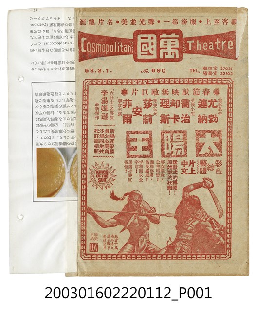 該面上標題為「萬國(Cosmopolitan Theatre)」、「顧客至上.服務第一.聲光並美.名片總匯」,以及日期「53.2.1」、期數「No. 690」、電話號碼「經理室37031、場務室32162」等字樣。其下為美國片《太陽王》(Kings of the Sun, 1963)的電影劇照及文案廣告,本片由聯美電影公司出品,李湯姆遜(J. Lee Thompson)執導,尤勃連納(Yul Brynner)、喬治卻卡理斯(George Chakiris)、莎莉安菲爾(Shirley Anne Field)等主演的劇情片,描述部族之間糾葛情愛與爭戰的故事。