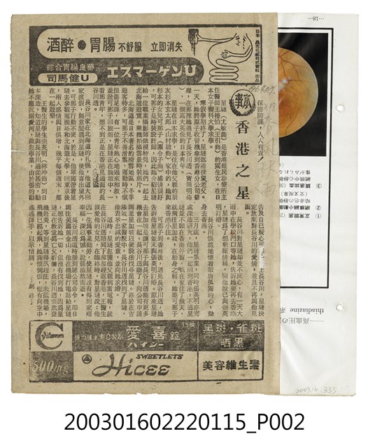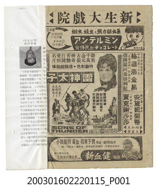 該面上標題為「新生大戲院」及藥品廣告;其下是義大利片《雷神太子》(Arrivano i titani/ Sons of Thunder)的電影劇照及文案廣告。本片由聯美電影公司出品,達奇歐泰沙利(Duccio Tessari)執導,格連洛金馬(Giuliano Gemma)、彼得羅阿曼德利斯(Pedro Armendáriz)、安黛妮樂蒂(Antonella Lualdi)、賈克琳莎莎(Jacqueline Sassard)等主演的古裝愛情打鬥片;下方另有藥品廣告。