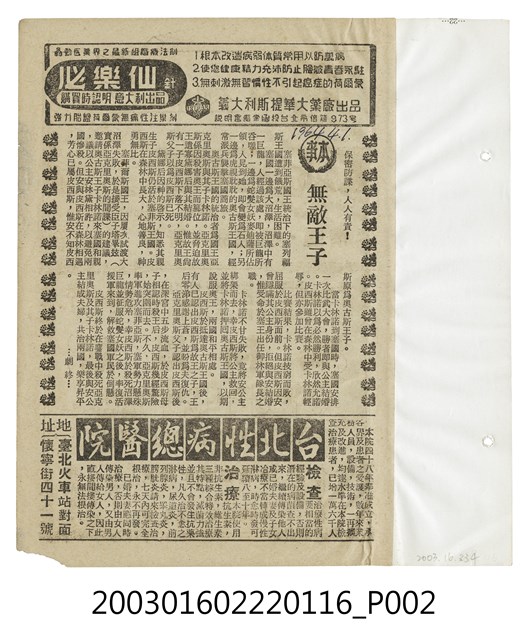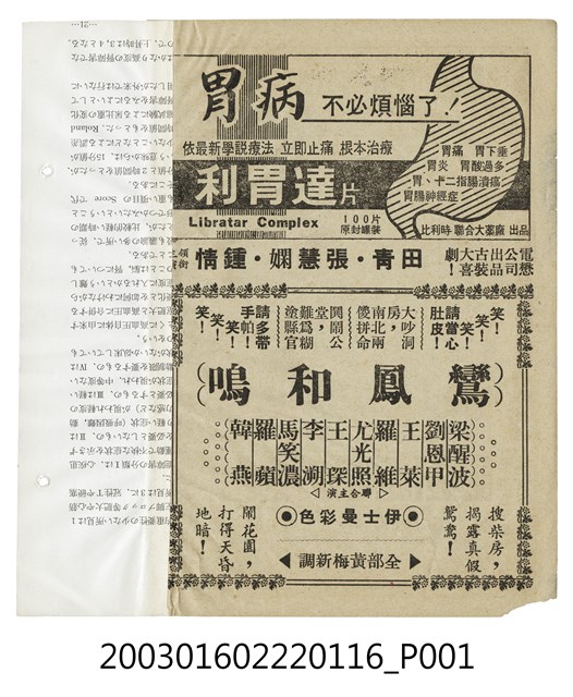 該面上有藥品廣告,以及國語片《鸞鳳和鳴》(1964)的電影文案廣告,強調本片是「電懋公司出品古裝大喜劇」、「全部黃梅新調」,並由羅維執導,田青、張慧嫻、鍾情等領銜主演, 梁醒波、劉恩甲、王萊、羅維、尤光照、王琛、李溯、馬笑儂 、羅蘋、韓燕等聯合主演的黃梅調彩色喜劇片,描述真假鴛鴦將錯就錯鬧上公堂的皆大歡喜笑料故事。