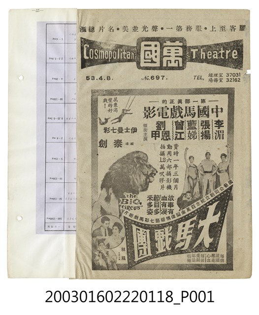 該面上標題為「萬國(Cosmopolitan Theatre)」、「顧客至上.服務第一.聲光並美.名片總匯」,以及日期「53.4.8」、期數「No. 697」、電話號碼「經理室37031、場務室32162」等字樣。其下為國語片《大馬戲團》(The big circus, 1964)的電影劇照及文案廣告,強調本片「第一部真正的中國馬戲電影」,由國藝影業出品,秦劍編劇及導演,李湄、張揚、藍娣、曾江、劉恩甲等主演的彩色時裝劇情片,描述圍繞馬戲團所展開的一連串精采表演及情感恩怨糾葛故事。