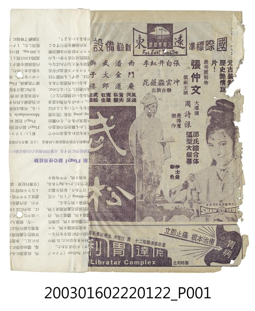 該面上標題為「遠東(Far East Theatre)」、「六聲帶戲院」,以及「國際標準、設備嶄新」等字樣。其下為國語片《武松》、又名《潘金蓮》(The Amorous Lotus Pan, 1964)的電影劇照及文案廣告,強調為「邵氏綜合體弧型大銀幕」。本片由香港邵氏出品,周詩祿執導,張仲文、張冲、白雲、井淼、紅薇、李昆等主演的古裝艷情片,描述潘金蓮天生麗質被逼嫁醜男武大郎,後與西門慶相好串通毒殺丈夫的故事。下方另有藥品廣告。