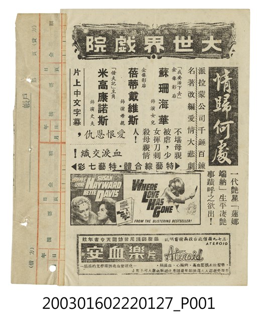 該面上標題為「大世界戲院」、「中央電影事業股份有限公司直營」等字樣。其下為美國片《情歸何處》(Where Love Has Gone, 1964)的電影劇照及文案廣告,本片改編自蓮娜端納(Lana Turner/拉娜透納)生平淒艷事跡,由派拉蒙電影公司出品,艾德華德米克(Edward Dmytryk)執導,蘇珊海華(Susan Hayward)、蓓蒂戴維斯(Bette Davis)、米高康諾斯(Mike Connors)等主演的愛情悲劇,描述一位少女殺死母親前任情人的故事。下方另有「安血樂」藥品廣告。