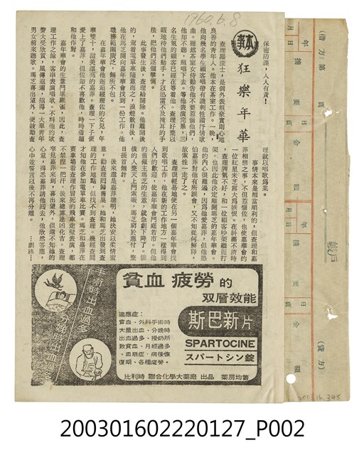 本件為臺北大世界戲院1960年代提供觀眾的電影本事,單色印刷,出自「竜沙影集」電影本事剪貼簿。