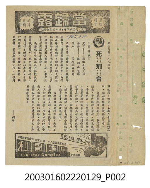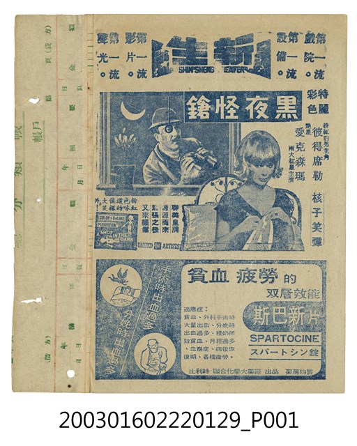 該面上標題為「新生戲院」等字樣;其下是《黑夜怪鎗》(A Shot in the Dark, 1964)的電影劇照及文案廣告。本片由聯美電影公司出品,布萊克艾德華斯(Blake Edwards)執導,彼得席勒(Peter Sellers)、愛克森瑪(Elke Sommer)等主演的偵探喜劇片,描述一名偵探前往郊區豪宅調查富豪的司機死因故事;下方另有藥品廣告。