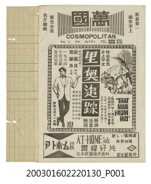 該面上標題為「萬國」(COSMOPOLITAN)、「服務第一.顧客至上」、「聲光並美.名片總匯」,以及日期「54.1.30」、期數「No. 731」、電話號碼「經理室37031、場務室32162」等字樣。其下為歐洲片《里奧追踪》(L'homme de Rio/ That Man From Rio)的電影劇照及文案廣告,強調本片為「一九六四年度全歐賣座冠軍」,由菲利普迪布卡(Philippe de Broca)執導,保羅貝爾蒙多(Jean-Paul Belmondo)等主演的冒險動作片,描述一年輕男子為拯救女友而展開的冒險經歷故事;下方另有藥品廣告。