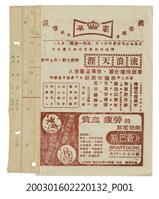 該面上標題為「豪華」、「國際標準」、「設備嶄新」等字樣。其下為美國片《流浪天涯》(In Search of the Castaways, 1962)的電影文案廣告,強調本片為「米高梅公司榮譽發行、繼『海角一樂園』後又一輝煌娛樂教育探險文藝巨片」、「藝術大師華德狄斯耐生平最佳得意傑作」,該片由羅勃史蒂文生(Robert Stevenson)導演執導,梅禮司雪佛萊(Maurice Chevalier)、海麗密兒絲(Hayley Mills)、喬治山德斯(George Sanders)、米契安德遜( Michael Anderson Jr.)、凱司赫姆休(Keith Hamshere)等主演的奇幻冒險片。