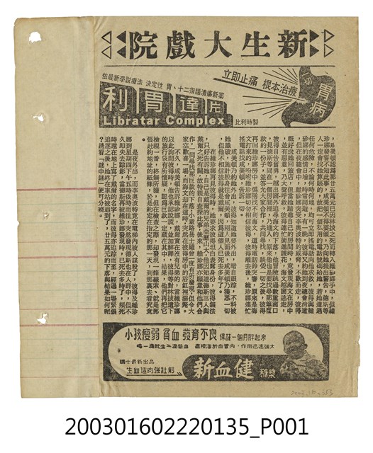 本件為新生大戲院1964年提供的電影本事,單色印刷,出自「竜沙影集」電影本事剪貼簿。共有二面,本件為第一面,館藏號2003.016.353為第二面。