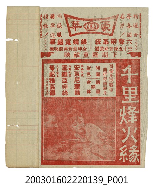 該面上標題為「豪華」、「精選世界各國名片」、「竭誠服務歡迎指教」、「六聲帶系統」、「銀鏡寬銀幕」、「下期隆重獻映」等字樣。其下為英國片《千里烽火緣》(East of Sudan, 1964)的電影劇照及文案廣告,由納坦朱蘭(Nathan Juran)執導,安東尼圭爾(Anthony Quayle)、雪維亞嬋絲(Sylvia Syms)、琴妮雅葛德(Jenny Agutter)等主演的戰爭愛情片。