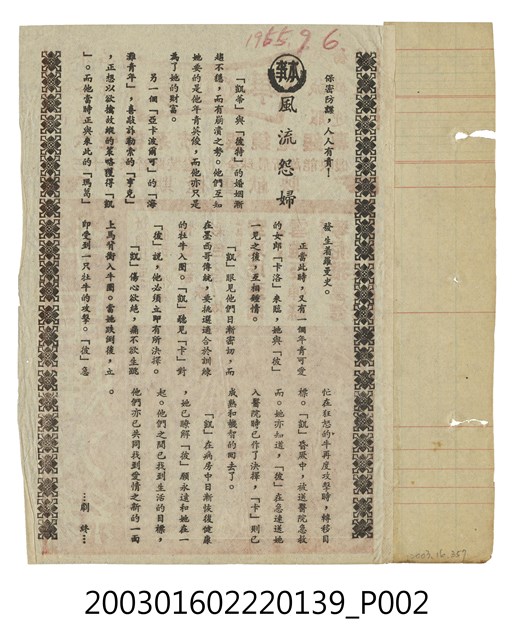 本件為臺北豪華戲院1960年代提供觀眾的電影本事,單色印刷,出自「竜沙影集」電影本事剪貼簿。