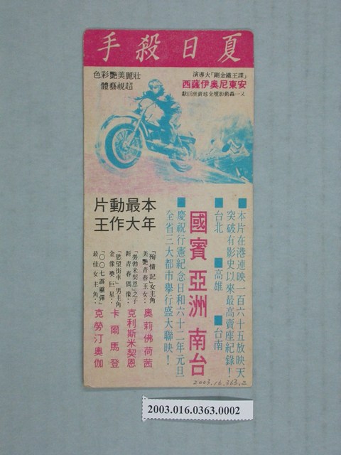 推測為桃園東海戲院發行《夏日殺手》書籤,雙面直式印刷。