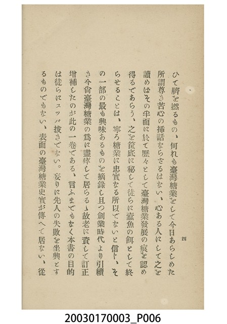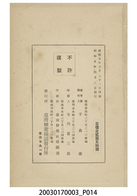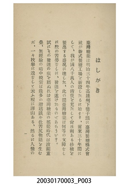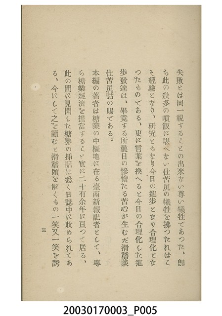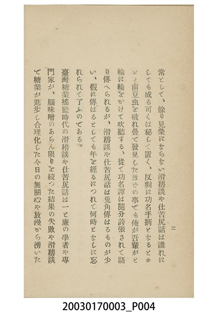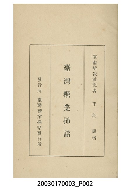 本物件為臺灣糖業插話,該書由臺南新報社記者手島康著,由臺灣糖業插話發行所發行,外觀書皮為米色,昭和5年4月2日發行,外觀保存完整。作者以其臺南新報記者的身分,收集了諸多臺灣製糖產業自明治34年臺灣製糖株式會社於橋頭設廠開始,臺灣糖業的相關滑稽趣談,集成此書。