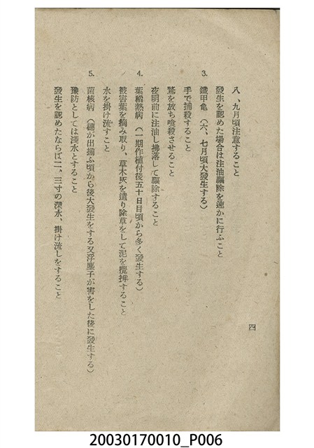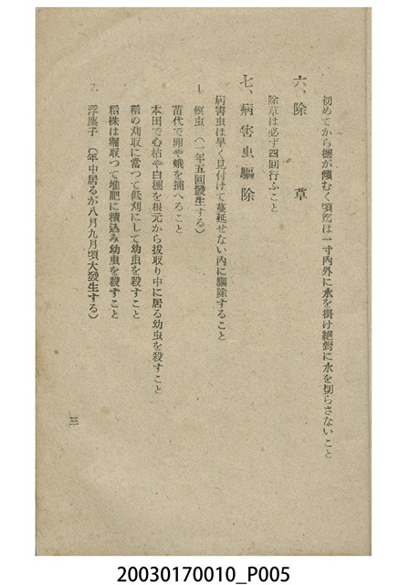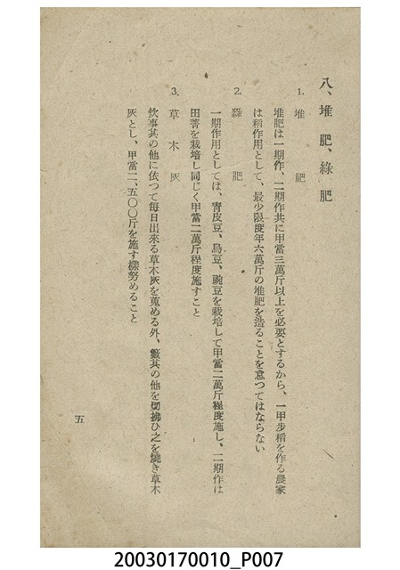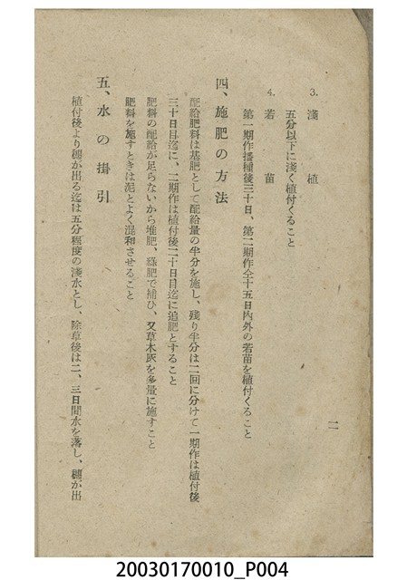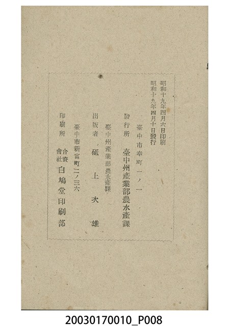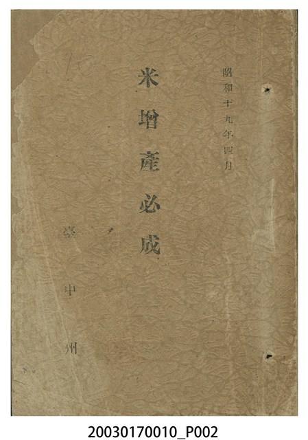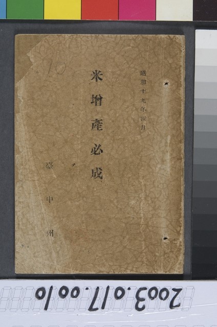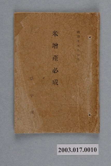 1.本物件為臺中州出版之《米增產必成》書籍。封面採直式印刷,中央為書名,右上部印「昭和十九年四月」,左下部印「臺中州」。無目次。正文包括本田深耕、健苗之育成、密淺植、施肥方法、灌溉、除草、病蟲害驅除、堆肥綠肥等8個部分。最末頁是版權頁,上載印刷、發行相關資訊。