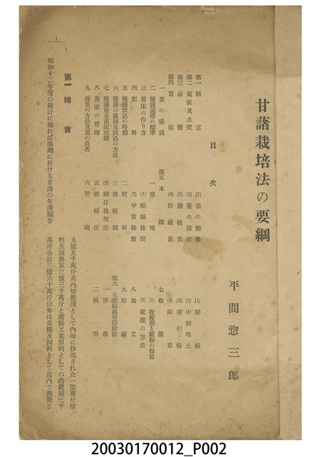 1.本物件為平間惣三郎撰寫的《甘藷栽培法の要綱》論文。封面採直式印刷,中央為書名,右上部直印「臺灣農會報第二卷第二、三月號別刷」,左下部印「臺灣總督府農業試驗所嘉義農業試驗支所」字樣。正文前有目次。內文包括緒言、氣候及土質、品種、苗床、本圃、主要病蟲害防蟲法等6個部分。無版權頁。
