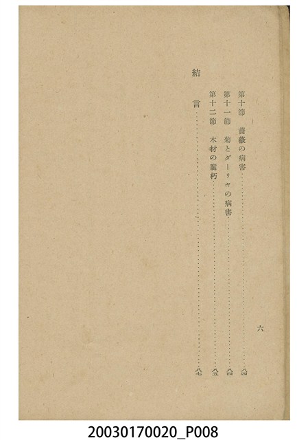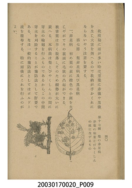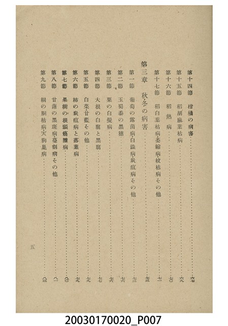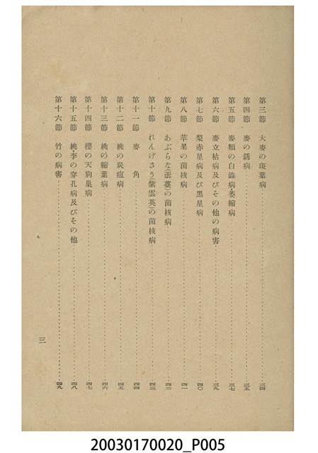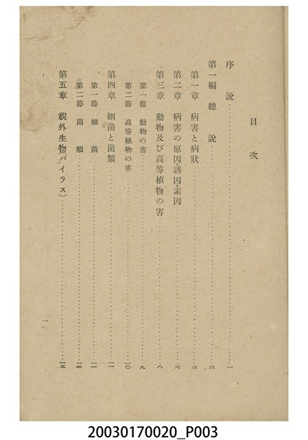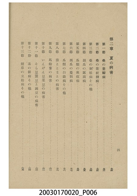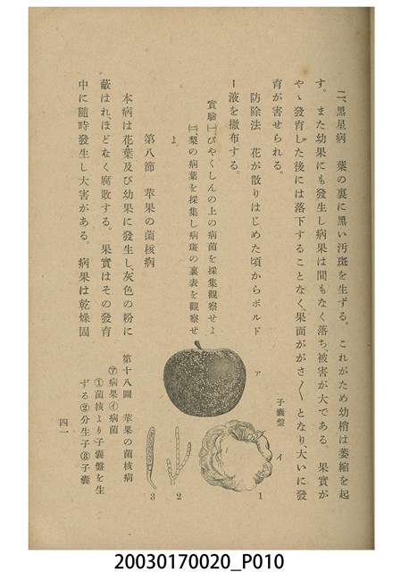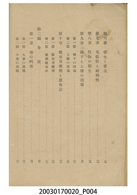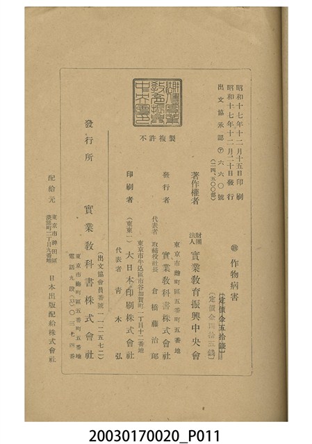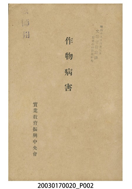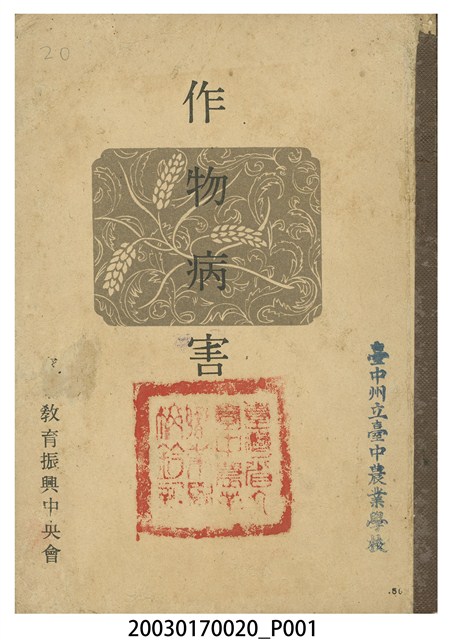本物件為財團法人實業教育振興中央會編纂之《作物病害》教科書。封面採直式印刷,中央設計稻穗幾何圖案底圖方框,框上覆蓋為部分書名;書名下方蓋有紅色關防「臺灣省立臺中農業職業學校鈐印」。封面右下部蓋有藍色「臺中州立臺中農業學校」條戳;左下部印「實業教育振興中央會」字樣。內頁封面左上角蓋有「教師用」字戳;右上部蓋有昭和18年4月5日文部省檢定完成戳章。正文之前有目次。內文分為總說、各說兩大部分,總說又分為病害和病狀、病害之原因與誘因、動物及高等植物之害、細菌和菌類、外來種生物、寄生和寄主、免疫性和耐病性、作物之衛生、種子和土壤之消毒、撒布用藥劑和撒布法等10章;後半部各說則分為春之病害、夏之病害、秋冬之病害等3章。文末附有結語。最末頁是版權頁,刊載定價及著作、印刷、發行等相關資訊。