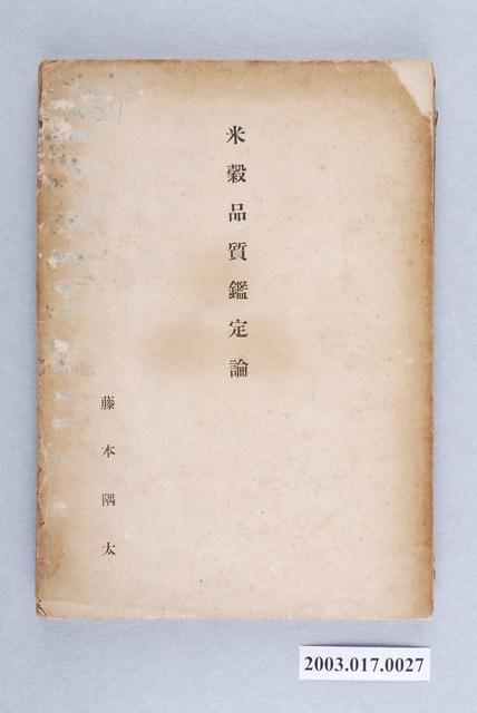 1.本文物為1941年藤本隅太著《米穀品質鑑定論》,其分為8部分,分別是「米穀品質の定義」、「米穀品質鑑定の目的竝其名稱」、「實用鑑定と專門品質鑑定家」、「肉眼鑑定の困難性」、「品質構成要素」、「米穀の種の理化學的鑑定法」、「米穀品質の數示」、「銘柄格差と等級格差」。