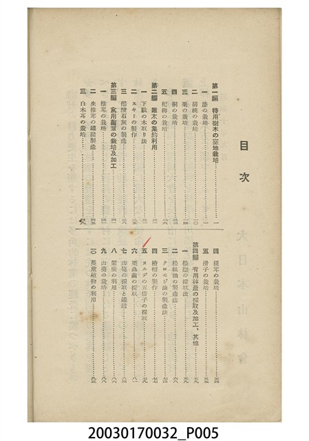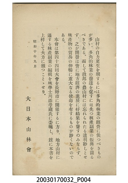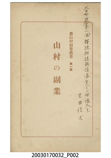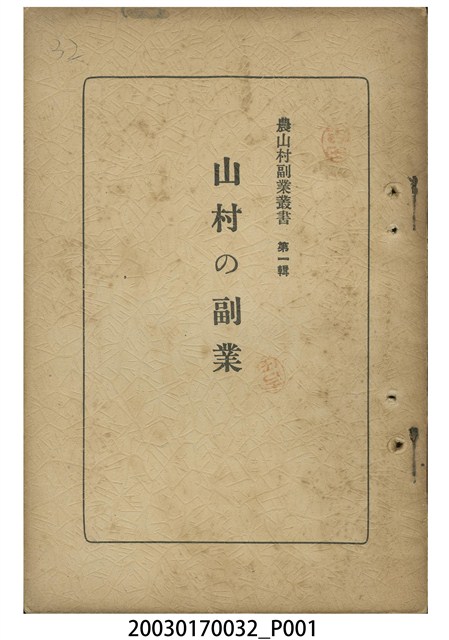 1.本物件為川添孝藏編輯的《山村の副業》書籍。封面採直式印刷,中間為書名,右上部印「農山村副業叢書 第一輯」。正文前依序是勘誤表、大日本山林會序、目次。正文內容包括特用樹木之空地栽培、雜木之集約利用、食用菌菇之栽培及加工、有用林產之採取及加工、其他等。最末頁是版權頁,上載書本定價及印刷、發行相關資訊。