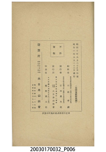 2.大日本山林會創立於西元1882年,創設目的在推動林業之改良與進步,由伏見宮貞愛親王任首任總裁;西元1915年改組為社團法人。戰後再改組為公益社團法人,存續至今。歷代總裁均由皇族擔任。