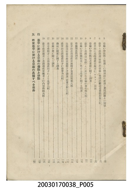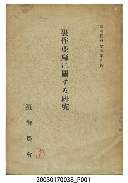 1.本物件為臺灣農會發行的《裏作亞麻に關する研究》書籍。封面採直式印刷,右上部直印「臺灣農會出版第四號」字樣,中間印書名,左下部印「臺灣農會」字樣。內文之前 有兩張亞麻相關照片、臺灣農會的序、目次。內文包括緒言、亞麻試驗成績、諸調查研究成績、臺中亞麻之優缺點、未來臺中亞麻的具備條件等5部分。最末是版權頁,刊載刊物定價及印刷、發行時地資料。