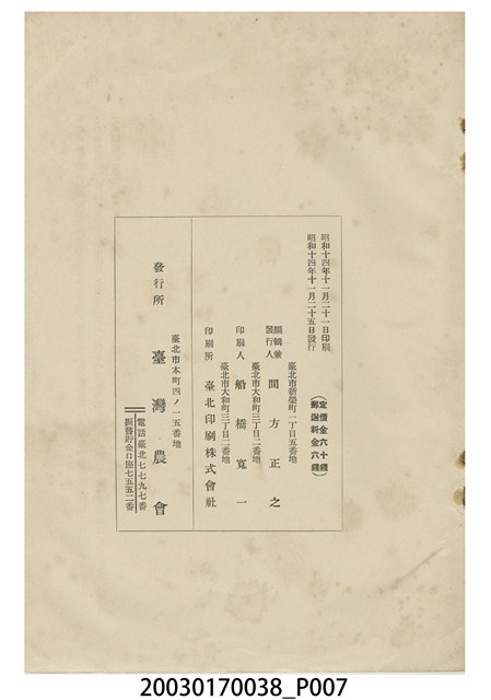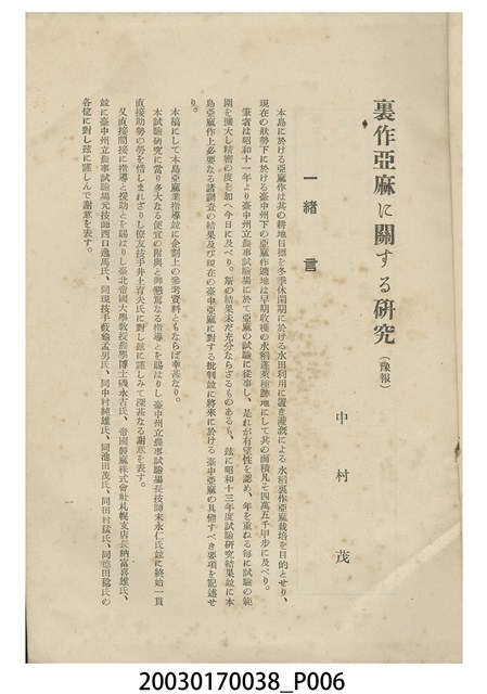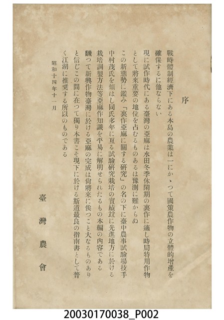 2.臺灣農會是昭和12年(1937)由總督府所設立,作為5個州農會和3個廳農會的上級指導機關。昭和18年12月,總督府發布「臺灣農業會令」,次年1月,臺灣農會改為臺灣農業會,臺灣農會共存續7年。本書刊載的內容,係臺中州立農事試驗場技手中村茂與同事多年以來亞麻試驗研究及栽培的實績,以作為未來推廣亞麻作物的指南書。