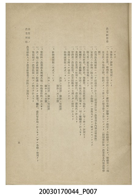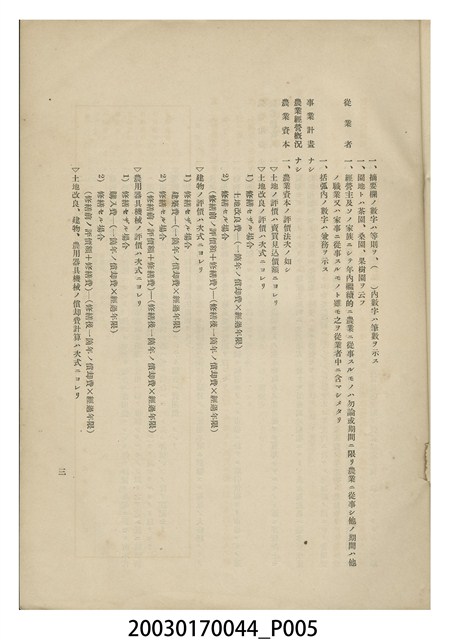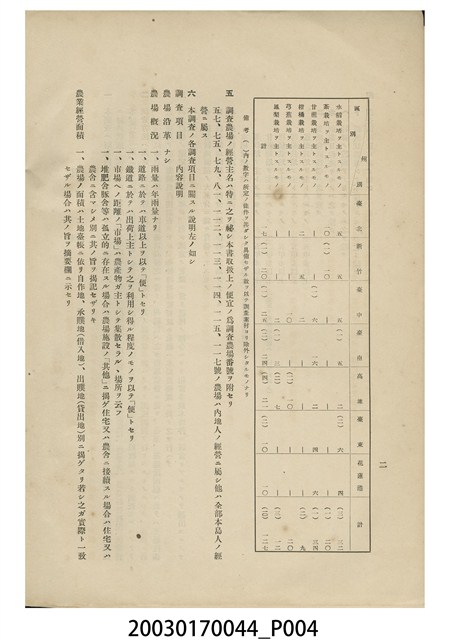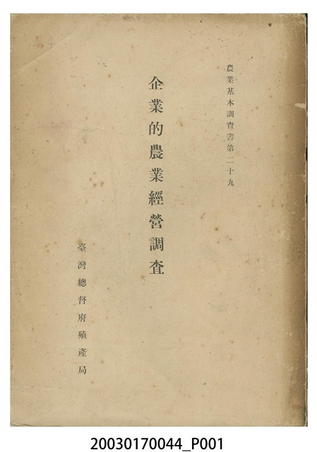 1.本物件為臺灣總督府殖產局發行的《企業的農業經營調查》書籍。封面採直式印刷,中央為書名,右上半部印「農業基本調查書第二十九」字樣,左下半部印「臺灣總督府殖產局」發行機關。內文之前有目次、凡例;內文之首為本書所刊登各農場的統計資料表;次分為水稻、茶、甘蔗、柑橘、香蕉、鳳梨等6大類,共117個農場,逐一刊載農場沿革、概況、經營面積、從業者、事業計畫、經營概況、資本、財產、收入、經營費等資料。最末是版權頁,刊載本書印刷、發行時地資料。
