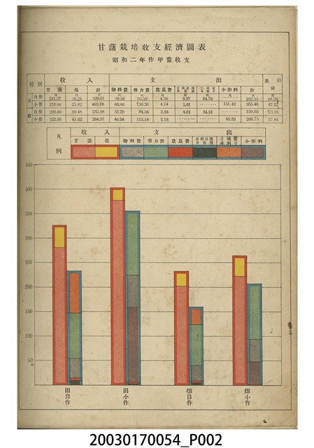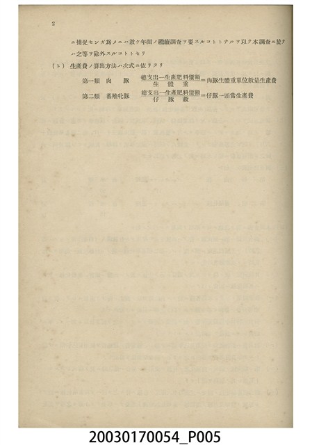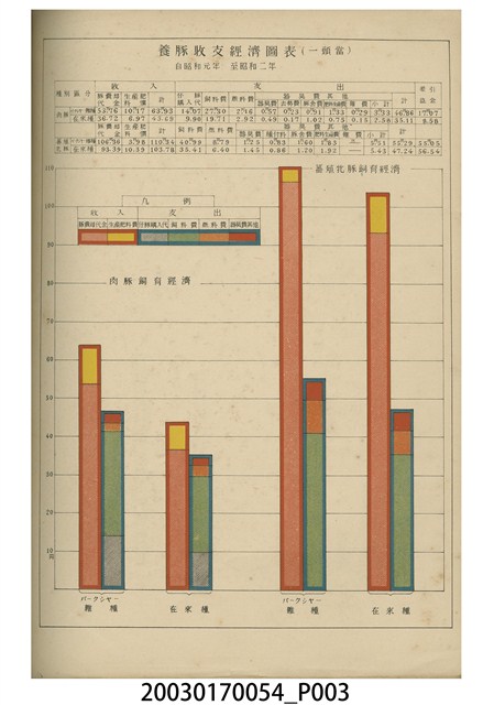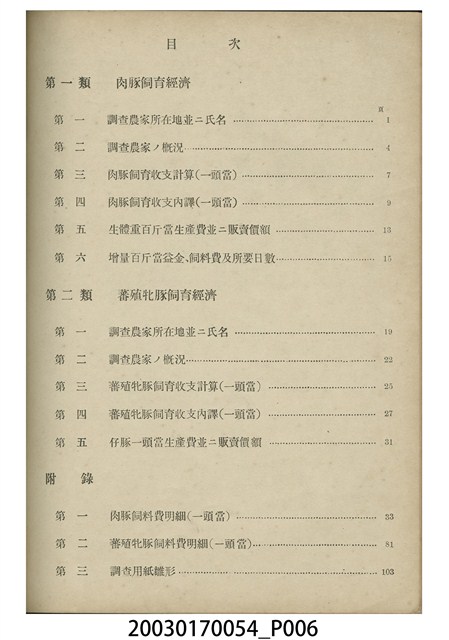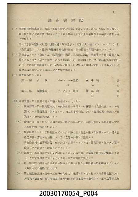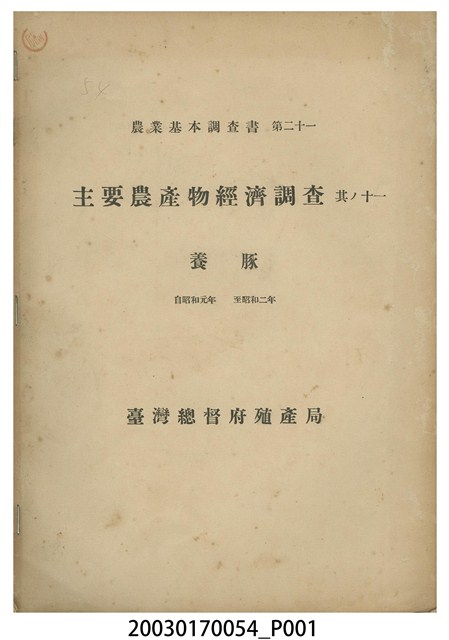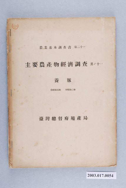 1.本物件為臺灣總督府殖產局發行的《主要農產物經濟調查其ノ十一》養豬篇之書籍。封面採橫式印刷,中央偏上方為書名,書名上半部印「農業基本調查書 第二十一」字樣;封面中央印「養豚」(即養豬是主要農產經濟調查的第11項)、「自昭和元年至昭和二年」兩排字;封面下半部印「臺灣總督府殖產局」刊行機關。內文之前有勘誤表、調查書解說、目次及兩張養豬收支經濟圖和生產費和販賣價格比較彩色圖表;內文前半部是6個肉豬飼養相關統計表;後半部是5個小豬繁殖飼養相關統計表;文末有3篇附錄。最末是版權頁,刊載本書印刷、發行時地資料。