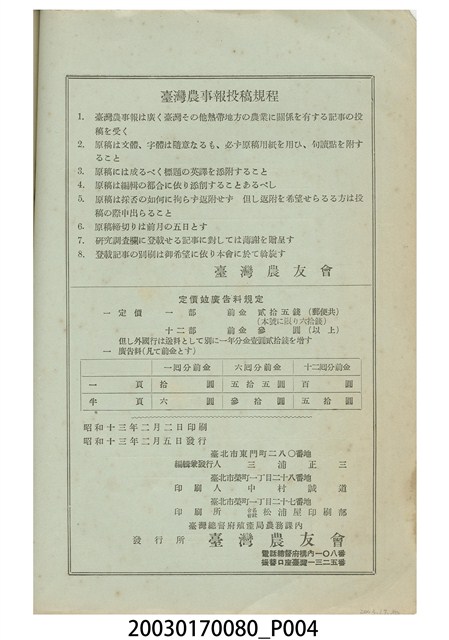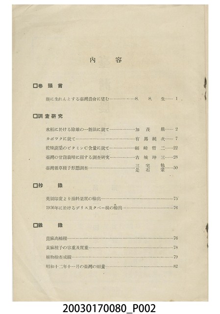 1.本物件為1938年發行的《臺灣農事報》第34年第1號刊物。封面上半部由上而下依序橫印「明治三十八年五月創刊」、「臺灣農事報」、「昭和十三年」、「1月」等4排刊名資訊;封面中央為主要目次;目次下方橫印「第34年 第1號」字樣;封面最下方橫印「臺灣農友會發行」字樣。封面之後是詳細目錄,目錄之後為內文。內文分為4大部分,首先是筆名S. S. 生撰寫的卷頭言;其次是5篇的調查研究論文;再次是2則抄錄;最末是4則雜錄。內文之後有1頁的廣告頁,廣告頁右半部為臺北種苗園的廣告;左半部臺灣農友會發行4本書籍的廣告;廣告頁之後為1頁篇幅之投稿規程、刊物定價及刊登廣告費用,以及出版資料。