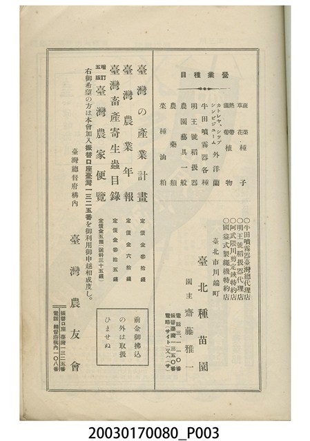 2.《臺灣農事報》原名《臺灣農友會報》,明治38年(1905)5月創刊,為臺灣農友會所發行的月刊,原目的在聯絡總督府農事試驗場講習生。自明治41年(1908)的第16期開始,更名為《臺灣農事報》,性質定位為「地方農會相聯合的機關冊誌」,主要刊載農業政策、農業技術資訊及地方農會報導。昭和14年(1939)《臺灣農會報》創刊,《臺灣農事報》自該年的第386期開始刊名加冠「南方農業科學」字樣,刊載內容轉為熱帶農業報導及指導熱帶、亞熱帶農業的學術性刊物。