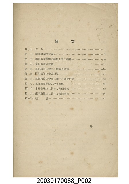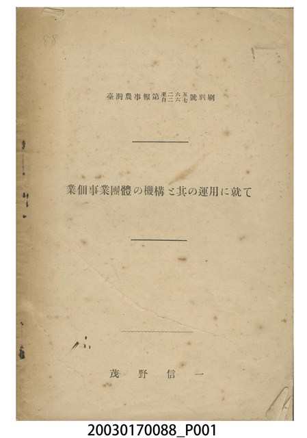 1.本物件為茂野信一撰寫的《業佃事業團體の機構と其の運用に就て》論文,抽取自《臺灣農事報》單篇論文印刷。封面採橫式印刷,中央為論文名稱;書名上方橫印「臺灣農事報自二六五至二六七號別刷」字樣;封面下半部印上「茂野信一」作者姓名。首頁為目次。內容分為緒言、業佃事業意義、業佃事業之實績、對業佃紛爭之積極調停、模範業佃之養成指導、有關業佃收益之分配調查研究、業佃事業團體之設立過程、本島農政上的業佃事業、產業政策上的業佃事業、結語等10個部分。